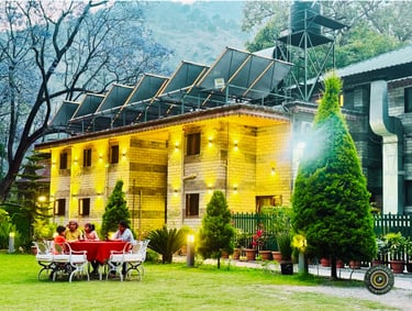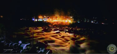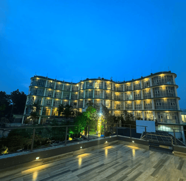 This enchanting view of Rampur Palace captures the charm of heritage architecture glowing under warm evening lights. The beautifully lit stone façade reflects timeless elegance against the serene mountain backdrop.