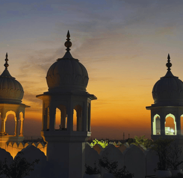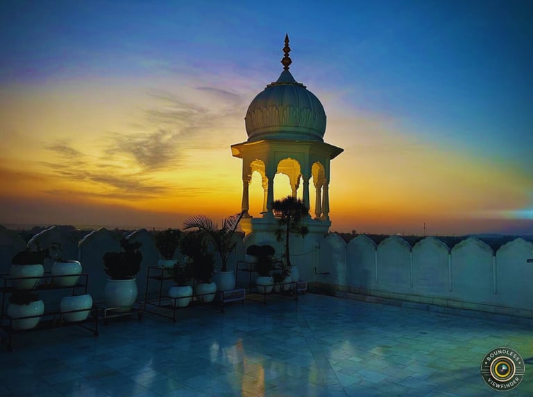 Bathed in the soft hues of sunrise, this serene view captures the spiritual calm of Anandpur Sahib. The elegant pavilion stands gracefully against the open sky, symbolizing peace and devotion.