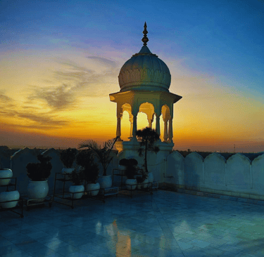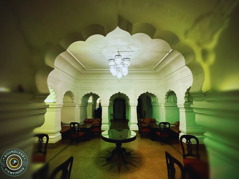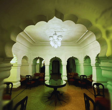 This elegant interior of Ramgarh Fort reflects the timeless grandeur of royal Indian architecture. Gracefully carved arches frame the space, creating a sense of symmetry & calm.