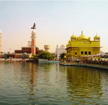 This mesmerizing image showcases the sacred Golden Temple, also known as Sri Harmandir Sahib. The shimmering golden façade reflects beautifully in the serene waters of the Amrit Sarovar, creating a scene of peace and devotion.