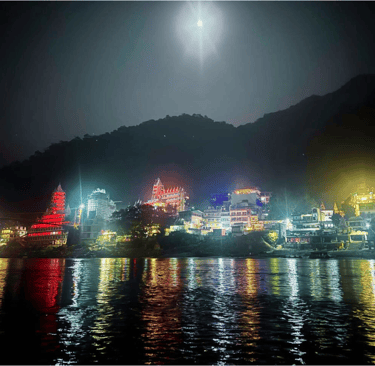 Bathed in moonlight, the Ganges River flows with quiet power, reflecting the vibrant glow of riverside temples and homes.The shimmering water mirrors centuries of devotion, culture, and timeless rituals.