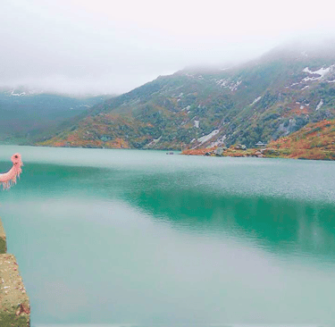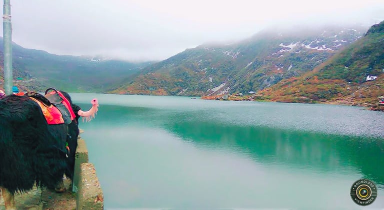 A traditionally adorned yak standing by the lakeside adds a cultural touch to the scenic panorama. Wrapped in drifting clouds and crisp mountain air, the landscape feels both mystical and serene. This iconic destination offers an unforgettable glimpse into the untouched charm of the Eastern Himalayas.