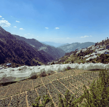Nestled in the serene hills of Narkanda, this breathtaking landscape captures the charm of apple orchards cascading along the mountain slopes. The neatly patterned plantations wrapped in protective nets reflect the region’s rich horticultural heritage.