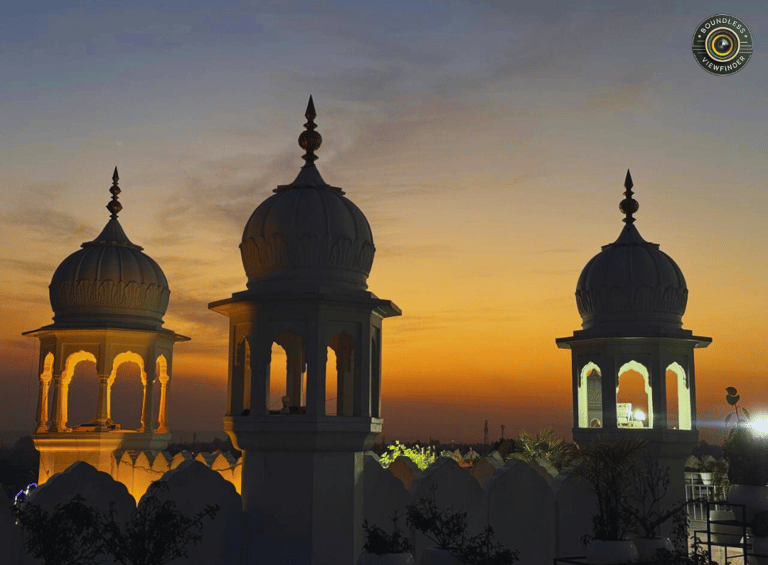 As dusk settles in, the illuminated domes rise gracefully against the warm evening sky of Anandpur Sahib. Soft golden lights glowing from within the pavilions create a serene and contemplative mood.