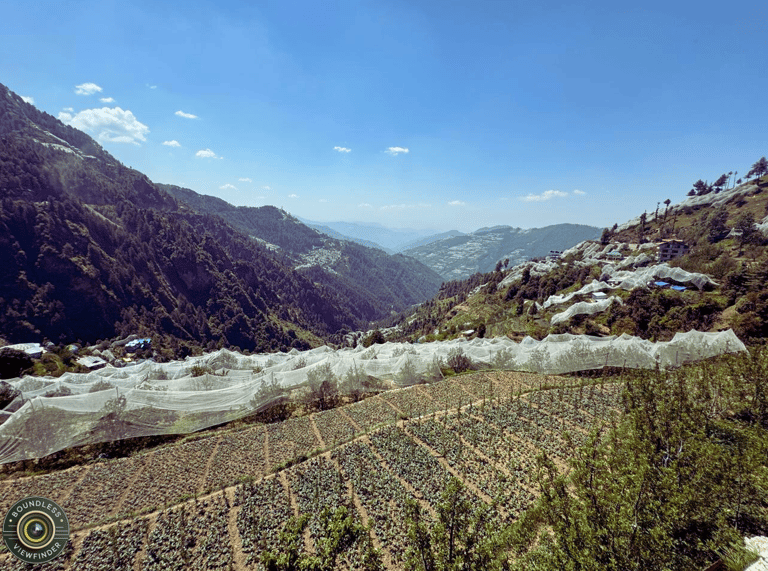 Surrounded by dense pine forests and rolling valleys, the view opens to layers of misty hills under a crystal-clear sky. Traditional hillside homes add warmth to the scenic panorama. This tranquil setting perfectly showcases the natural beauty and agricultural soul of Himachal Pradesh.