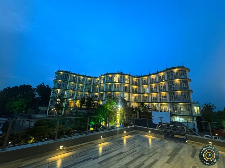This captivating night view of the Public Works Department Himachal Pradesh building highlights its elegant colonial-style architecture under warm illumination. The soft lighting enhances the symmetry of the structure, while the cool-toned roof edges add a striking contrast against the dark sky.